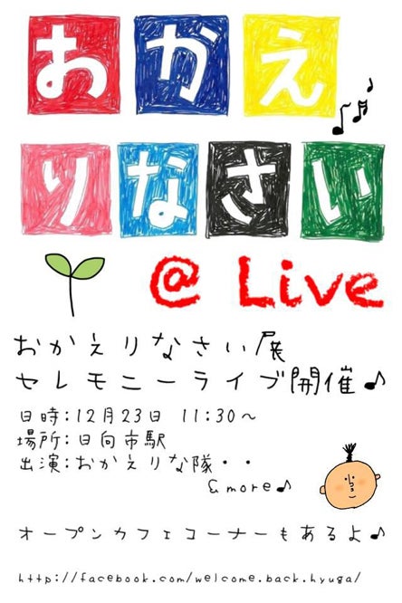 おかえりなさい展セレモニーライブも日向市駅にて開催させて頂けることになりました。お近くをお立ちよりの際は冷やかし歓迎、ぜひ遊びにいらしてください!