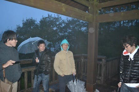 >>>おかえりなさい展の活動風景。朝日を撮影するため早朝、運営委員会のみんなで山に登りましたが、急な雨により朝日は拝めず。。。でも特にくじけることなく、展示会の開催に向け全力邁進中です!!実行委員坂本君(写真右端)の名言「とりあえず、行けるとこまで行きましょう!!」が僕らのコンセプトです(笑)