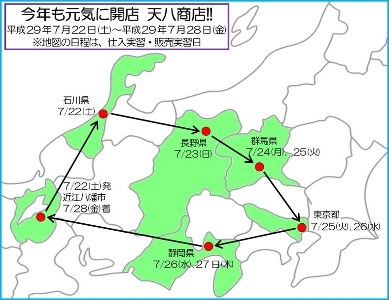 これまで、東北や北関東などの近江商人にゆかりのある地域を訪問し、行商や仕入れ実習を行ってきました。昨年は、7月21日から27日までの7日間で石川県・新潟県・群馬県・埼玉県・東京都・静岡県を訪問して実習させていただきました。