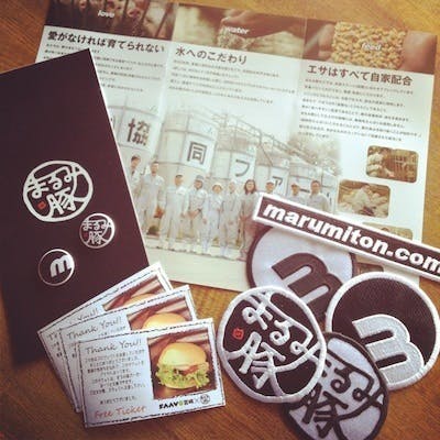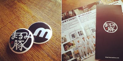 ▲まるみ豚オリジナル缶バッチ&想いが詰まったリーフレット