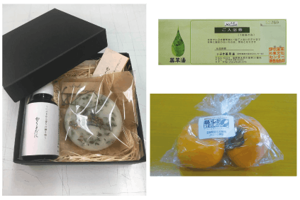 10,000円のご支援をいただきました皆様には、感謝状とワックスバーとルームスプレーのギフトセット1個、伊吹薬草の里文化センター・いぶき薬草湯の入浴券3枚、そしてひらたねなし柿と最高級品・霊峰の食べ比べセットをお届けさせていただきます。