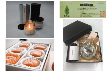 30,000円のご支援をいただきました皆様には、感謝状とワックスバーとルームスプレーのギフトセット1個、アロマキャンドル3個入りセット、伊吹薬草の里文化センター・いぶき薬草湯の入浴券3枚、そして最高級品・霊峰6個入りセットをお届けさせていただきます。