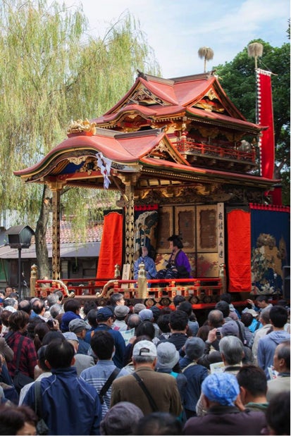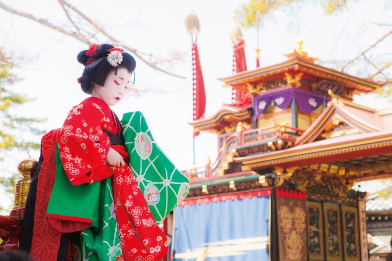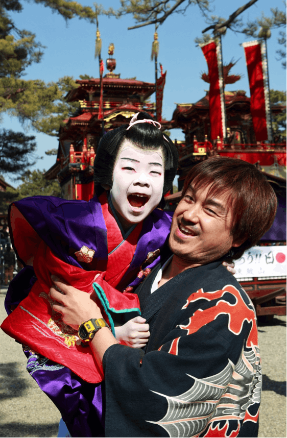 まつりの魅力はなんといっても子ども歌舞伎。5歳から12歳の男の子が演じ、春休みを返上して稽古をして本番に臨み、大人顔負けの演技を披露します。まつりの開催期間中のうち13日から16日に曳山が曳き出され、子ども歌舞伎を披露します。