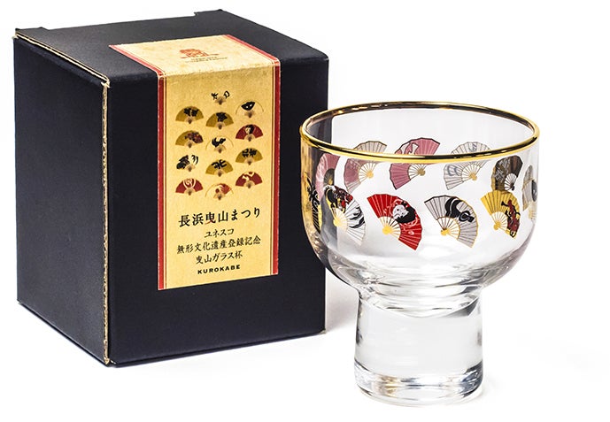 曳山まつりに関わる13の山組を象徴する扇子の柄を配したユネスコ無形文化遺産登録記念の「曳山ガラス杯」です。