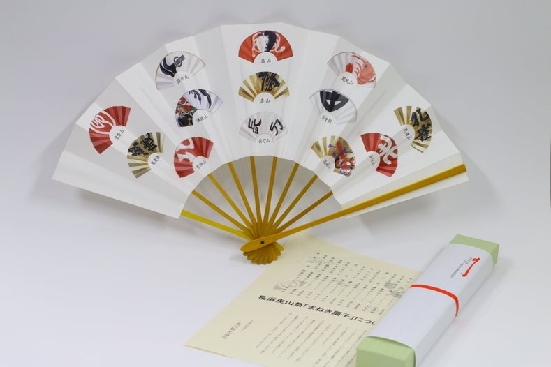 ▲曳山を有する13の山組は、福を招くまねき扇子と呼ばれる扇子を作ります。それら山組のまねき扇子をデザインした長浜観光協会の「長浜曳山まつりオリジナル扇子」です。