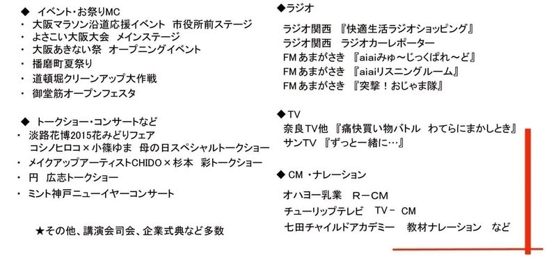 大阪・船場に生まれ育つ。MCとしてのキャリア10年を超え、大阪を中心にフリーランスでイベントやお祭り、式典、披露宴などの司会をメインに活躍。また、セミナーやイベントのコーディネーターとしても活動中。 2013年以降は、司会者としての目線で『場を読み、動かし、司る』ことをプロジェクト、企業、地域などの様々な場面で活用している。 なにわMCとして活動する傍ら、平日限定で完全クチコミだけのバイオレゾナンス(共振共鳴)機械のオペレーターとして活動。カウンセリングも織り交ぜながら、心と体の健康を司るお手伝いも行なっている。