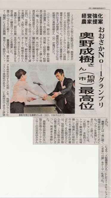この「耕作放棄地でのオーナー制ワイン用ぶどう園」のプロジェクトを、今年2017年の1月に開催された若手農家のビジネスプランコンテスト「大阪No(のう)-1グランプリ」で発表させていただきましたところ、グランプリをいただくことができました。