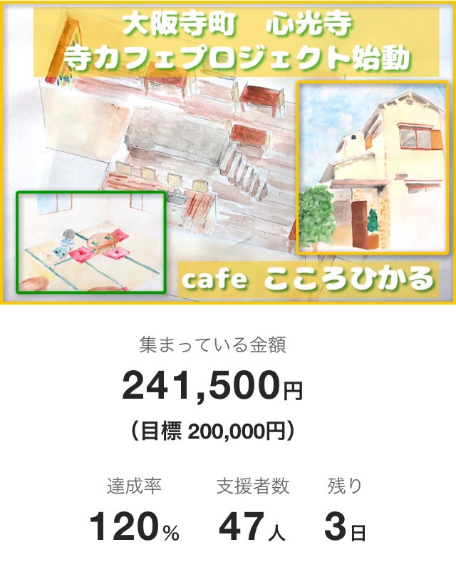 2017/11/16 19:599月1日にクラウドファンディングのチャレンジがスタートして3ヶ月…めちゃくちゃ濃い3ヶ月を過ごしてます。 今年の思い出は…間違いなく寺活!!cafe こころひかる!!以外ないと思いますヾ(≧∀≦*)ノ〃 心光寺はそれぐらい魅力的な場所なんですよね〜。ご存知の方は、うんうんって頷いてくれてるはずです(笑) そんな素敵な場所が本堂以外にカフェという憩いの場として増えるんですよ!!もう︎最高ちゃいますか??(≧∇≦) 『cafe こころひかる』にたくさんの方々に来てもらいたい!!純粋にただそれだけでここまで頑張ってきました。 そして、これからもまだまだオープンに向けてメンバーと一致団結して頑張って行きます!! ですので、リノベーション資金の一部をご支援いただけないでしょうか?? 残り30時間をきりました!!昨日SNSでお伝えしてからまた支援していただくことができ、あと36,500円でストレッチゴール達成します(๑•̀ㅂ•́)و あと少しなんです…どうか、どうかよろしくお願い致します(((o(´>ω<`)o))) 広報:宮﨑 もっと見る