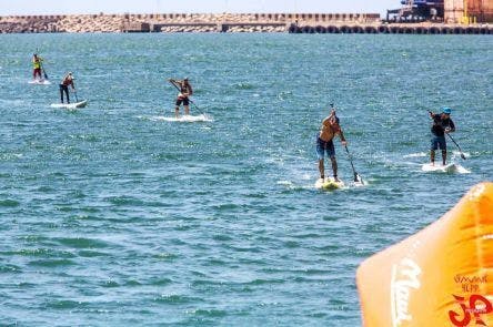 フィニッシュライン手前1kmは港の中になり波は無いですが、横風を受けながら漕ぎ続けます。