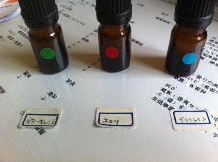 生徒さんは、香るのははじめてだと思うので、3種類あることを説明して、A、B、Cとだけ書かれた瓶を渡します。