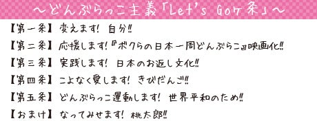 ▲映画製作委員会メンバーです! 私達は、映画化サポーター「どんぶらっこ」を募集しています。 「どんぶらっこ」は、単なる映画化サポーターにとどまりません。 「ボクらの日本一周どんぶらこ」映画化を応援することを第一の目的としていますが、どんぶらっこ主義「Let's Goヶ条」にもとづいて人知れず善行を行う活動(どんぶらっこ運動)も行います。 ▲どんぶらっこ主義「Let’s Goヶ条」 ▲「どんぶらっこ」が中心となって行う、県内の市町村できびだんごを配って回る企画、ボクらの岡山一周どんぶらGO!ムービー
