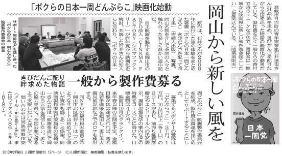 映画製作資金として全額を、自主映画を製作する岡山市のNPO法人「CINEMA FACTORY」へ寄付します。岡山の映画(こころ)を創らせてください! ▲活動は地元紙やタウン情報誌でも取り上げて頂きました!