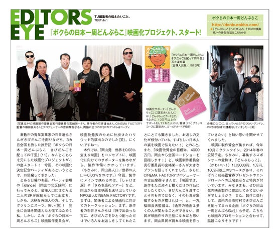 今回、岡山県倉敷市の「たつんこ」こと石井達也さんが、2009年に敢行した、きびだんごを配りながら全国を巡り、各地の人々との絆を深めた体験をまとめた著書「ボクらの日本一周どんぶらこ」を映画化します! ▲「ボクらの日本一周どんぶらこ」(吉備人出版)表紙。 岡山名物のきびだんごを介して、全国の人々と触れ合った楽しく温かい道中記です。 「ボクらの日本一周どんぶらこ」は、 タツヤが相棒のマサキをつれの~て(連れ立って)きび団子を配って、日本一周の旅!をするお話です。 日本一周の旅の道中に出会う人々とのふれあい、(本人たちはいたって真面目だけれど)なぜか面白くなってしまう様々な経験をし、そんな中で関わった人々にお礼の気持ちを込めて「一粒のきび団子」を渡します。 純粋な二人の感謝の気持ちに、行く先々で返される日本独自の文化・・・『お返しの心』 タツヤとマサキは旅の終わりに何を見つけるのか??心温まる旅の記録です。