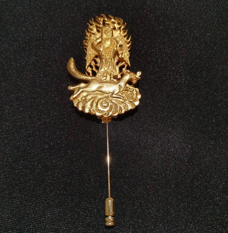 それがこちら、上杉謙信公所用「飯綱権現前立兜色々威腹巻鎧」の兜の前立てをかたどったラペルピンです!製作には、埼玉県の甲冑職人「忠保」さんのご協力を頂きました。