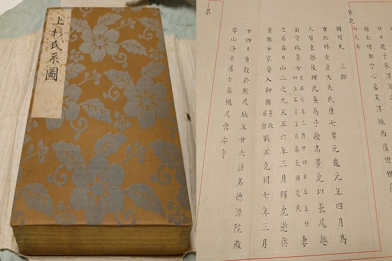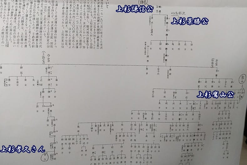 上杉家にお招き頂いた折には、本家と子爵家に1冊ずつある上杉氏家系図も見せて頂きました。同じ家系図で本家にあるものはなんと【国宝】だそうです。藤原姓上杉氏・・・藤原鎌足公に始まる家系図、上杉謙信も景虎の名で登場しますが、それも中盤。とんでもない重厚な系図でした。