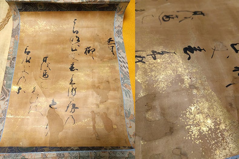 こちらは、謙信公直筆とされる書。謙信公の直筆文書でも薄墨でくすんだような灰色がかった再生紙が多い中、こちらは金で草花が描かれている高級紙。当時、相当貴重な紙であることから引き筆の書であることはほぼ間違いないとされているようです。