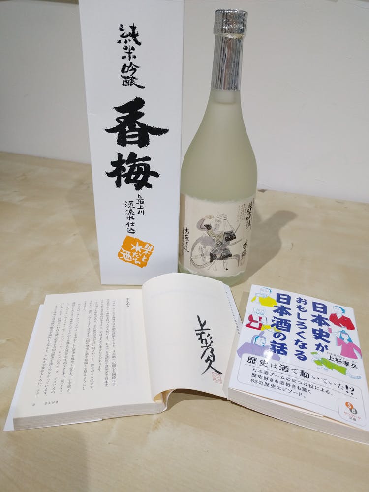 限定ラベルの純米吟醸酒「香梅」に日本酒プロデューサー・上杉孝久さんの著書「日本史がおもしろくなる日本酒の話」をセットにしてお送りします。直筆サイン入り!