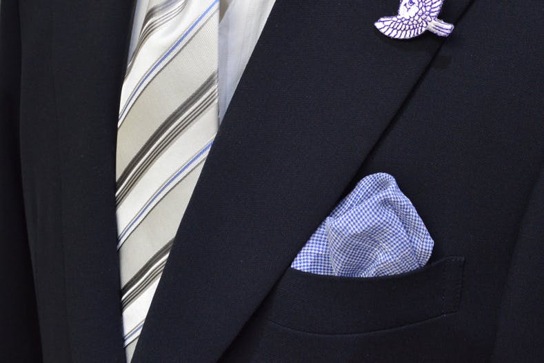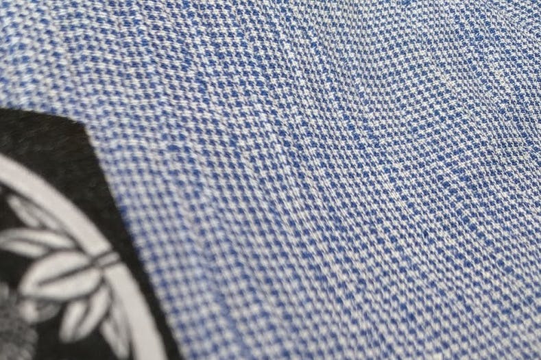 今回は小千谷ちぢみ(麻)から、謙信公のイメージで使われることの多い青を採用。約26cm四方のポケットチーフに仕上げました。