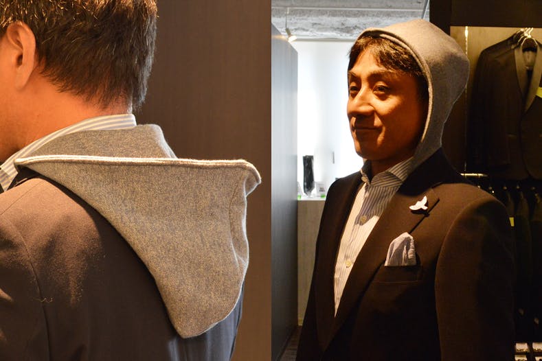 今回は謙信公が上杉を名乗るきっかけとなった山内上杉氏より家督とともに譲り受けた関東管領(かんとうかんれい)と、ゲームや映像でよく描かれる頭巾(行人包み)の姿をモチーフに着脱可能なフードを作りました。ちょっとした雨の時に雨除けとして使えるフード・・・「関東管領+レインフード=関東管領ンコート」です。ジャケット、スーツのオプションとしてご用意しました。