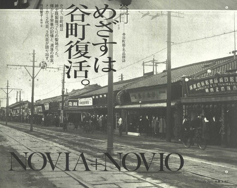 下記の写真は昭和初期の谷町筋です。大阪城周辺の谷町筋には路面電車が走り、紳士服店がひしめき合っていました。雑誌「大阪人」にて当社の谷町紳士服復活について特集頂いた際の1ページです。