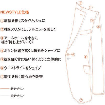 武将スーツでは、その若手が中心となって開発した新しい型紙を採用。現在主流の「肩幅」を小さくし、肩パットを薄くしたソフトなジャケットになっています。アームホールを縦楕円ではなく、横楕円にし、肩を上げても脇の生地が釣られて引っ張られないデザインになっています。衿も首に吸い付くように付け、ジャケットの重みが首と肩とバランスよく、かかるようにして、ジャケットの重みを感じさせなく、肩の凝らないジャケットになっています。