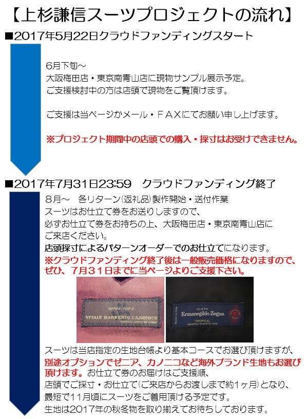 ※クラウドファンディング期間中に大阪梅田店、東京南青山店に直接ご来店いただいても、上杉謙信ジャケット・スーツはお買い求めいただけません。