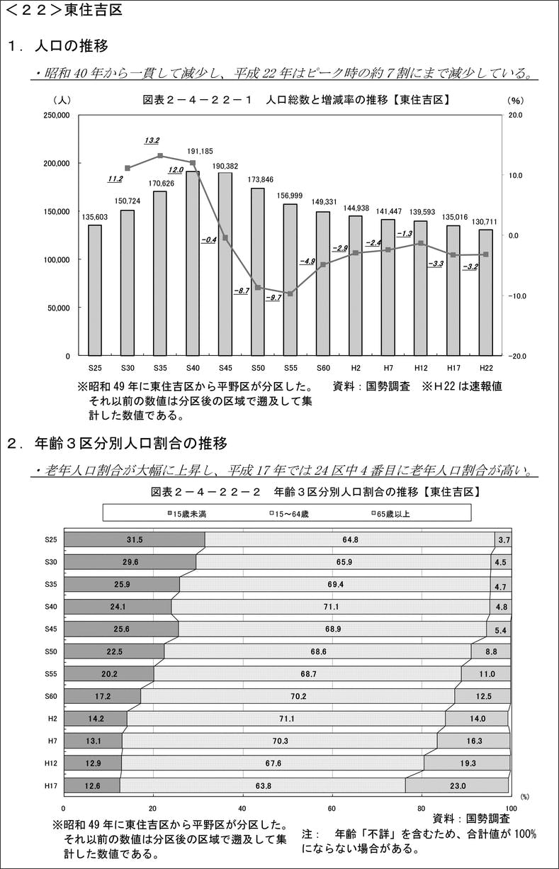 また、年齢区分別人口割合の推移を見ても、老年人口割合が大幅に上昇し、直近の調査では平成17年では、大阪24区中4番目に老年人口割合が高いというデータが出ています。