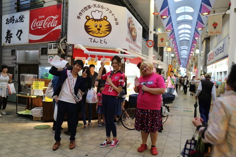 MCの「リルガーデン」さんと、ゲスト出演頂いたセレッソ大阪イメージモデル「セレッソ大阪応援ナビゲーター」の「渡邊みさき」さんに商店街を紹介頂きました。