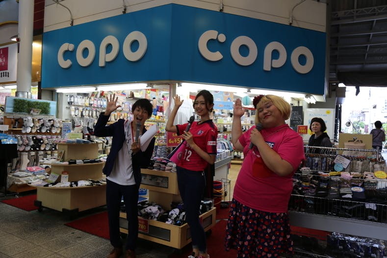 MCの「リルガーデン」さんと、ゲスト出演頂いたセレッソ大阪イメージモデル「セレッソ大阪応援ナビゲーター」の「渡邊みさき」さんに商店街を紹介頂きました。