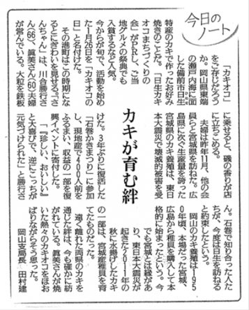 今朝の読売新聞「今日のノート」で、昨年の石巻市での東北復興プロジェクト(第2弾)のことが「カキが育む絆」として紹介されました! 今日のNHK「ひるブラ」 は、岡山県備前市日生町からの生中継だったし、賑やかな1日でした! さて、1月26日は「カキオコの日」です! その前日、1月25日には、昨年同様、カキオコパーティーを予定しています。 みなさん、なんじゃろーと日生に「カキオコ」を食べに来てくださいね!
