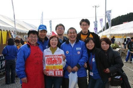 この日は、3か月ぶりの福興市「志津川湾さけまつり福興市」が開かれるとあって、朝から賑やかな雰囲気でしたが、その中に福興市の実行委員長・山内さんを見つけて、早速、記念撮影。