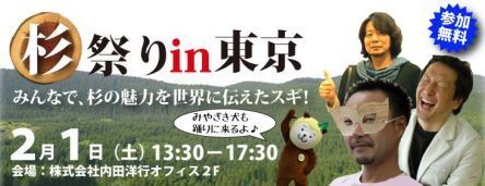 みなさん、こんにちは! 世界展開プロジェクトチームの桑畑夏生です。 前回、11月30日に宮崎に市内で開催したイベントの報告をさせていただいたのですが…な、なんと!東京でもイベントを開催します! その名も「杉祭りin東京 ~みんなで杉の魅力を世界に伝えたスギ!~」 https://www.facebook.com/events/183579895169890/ 私たちの杉への想いを、直接お届けしたい 平成19年に日南市役所内に創設されたプロジェクトチーム「飫肥杉課」。 当初から本プロジェクトに関わっている行政の方、民間企業の方、そして、その想いに惚れて世界展開プロジェクトチームを立ち上げたNPOの方にご登壇いただきます。 なぜ私たちが「飫肥杉を世界に発信しようと思ったのか」 その想いを皆さまに直接お伝え出来ればと思います。 宮崎、そして日南を堪能していただくコンテンツが盛りだくさん! 今回は、"祭り"ですので、ご来場いただいた皆さんに楽しんでいただけるような場にしたいと思っております。 先日、ゆるキャラダンス選手権二連覇を果たしたみやざき犬が来場してくれる予定です。 そして、懇親会では、宮崎のおいしいものをご用意しております。 うわさのあの2人も登場します! 飫肥杉界では有名なこの方も来場予定。 親戚の飫肥杉ガールも、デートの予定を変更して駆け付けてくれるようです。 皆さまと杉の魅力、そして可能性を一緒に探求できればと思っております。 皆さまのご参加、心よりお待ちしております 【お問合わせ先】 ご質問・ご相談があればお気軽にご連絡ください。 飫肥杉デザイン世界展開プロジェクトチーム(担当:桑畑夏生) TEL/090-5280-2336 E-Mail/ natsuki.kuwahata@gmail.com