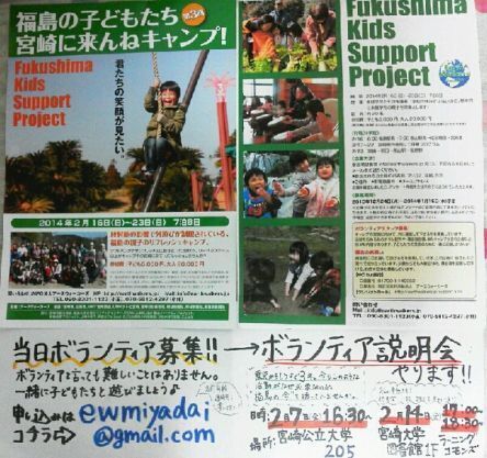 みなさま、あたたかいご支援、本当にありがとうございました。 報告集やダイジェストDVDも制作していくので、楽しみに待っていてください! さて今回は、報告DVDより一足早くキャンプの様子をご覧いただける機会をご案内させていただきます 。 「福島の親子のために」と題し、今回のキャンプの様子が25分間の番組になりました。 3/14 19:30〜19:55 NHK宮崎放送局 3/16 7:45〜 8:10 NHK宮崎放送局(再放送) 宮崎熱時間「福島の親子のために」 キャンプの8日間に加え、キャンプ前にも福島でロケが行われ、 参加者の皆さんの日常も描かれます。 福島で小さなお子さんをお持ちの方達が、どんな暮らしをし、どんな思いで宮崎の保養キャンプに参加されたのか。 宮崎の保養キャンプで、 初めての体験を通して、普段見せない笑顔が見れたり、心や身体にどんな変化があったのか。 すべてをお伝えしたいくらいですが、約30時間にも及ぶ収録を25分にまとめた番組になっています。 宮崎県のみでの放送ではありますが、可能な方はぜひ見て頂けたらと思います。 よろしくお願いいたします。