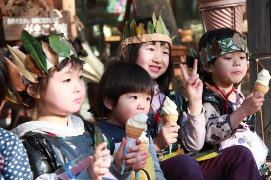 ▲久しぶりに落ち葉と戯れたあと、ソフトクリームを食べてみんな笑顔♩