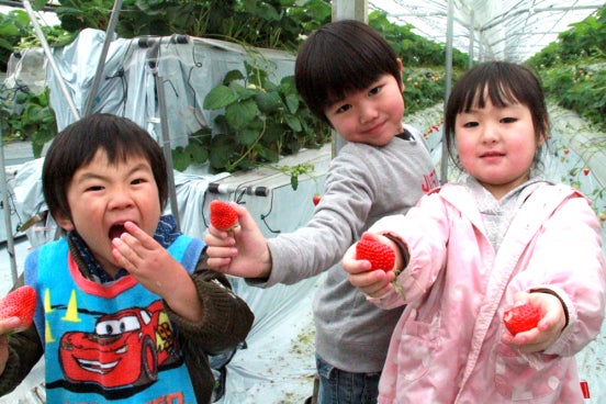 ▲取れ立てのイチゴを美味しそうに食べている子どもたち♩