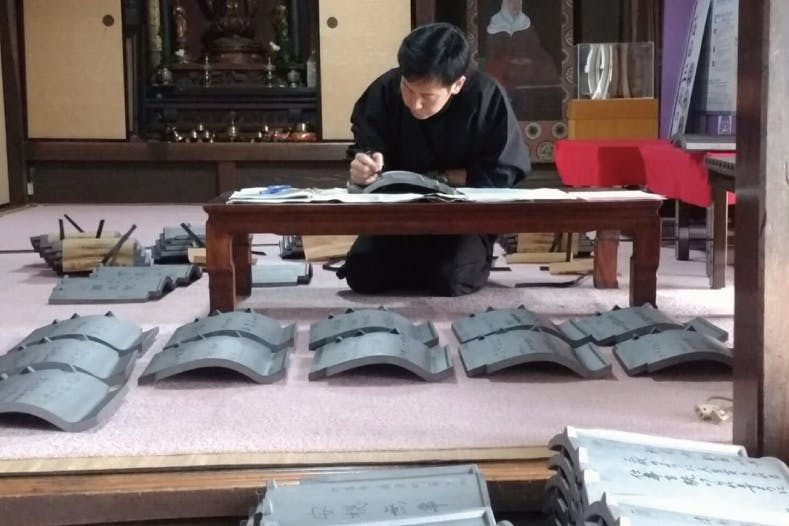 30,000円のご支援をいただきました皆様には、今回の修復において葺き替えられる新しい瓦に、「お名前」、「ご住所」、そして「お願い事」を、観音寺の林住職により書かせていただき、その写真をお届けさせていただきます。これらの瓦は、平成29年12月から平成30年7月に実施されます工事において、薬師堂の屋根に納めさせていただきます。