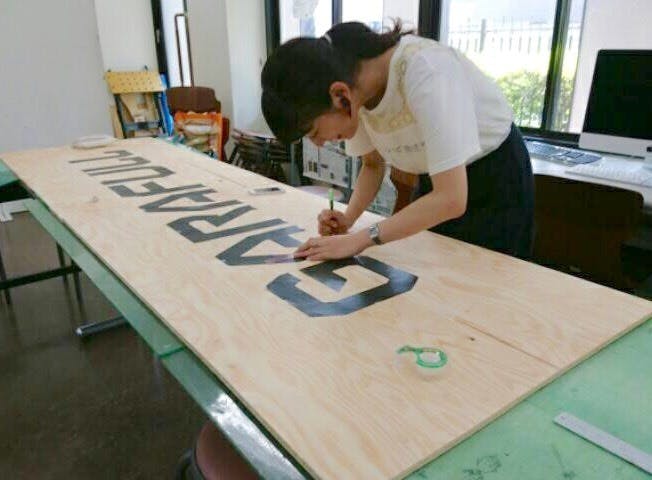 今日はガラフルのロゴを木の板に書き写す作業をしていました。