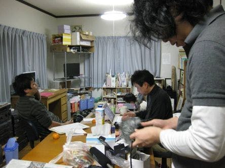 夜遅いにもかかわらず、仕事が終わった後メンバーが事務所に集まってきます。小道具や衣装の検討、俳優やロケ地の手配、機材の調整など、やることが山積みです。