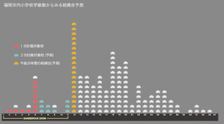 ボクたちは今回の大名小学校廃校は、単に1つの小学校の廃校ではないと考えています。 その理由に、これから福岡市や日本でおこる人口減少による小学校の統廃合があります。 以下に書く内容は昨年4月にKFKが作成した提言書を参照したものです。 少し固い内容ですが、最後まで読んでいただき今回のイベントの意味をご理解いただけたらと思います。 ではでは。 今回の大名小含む、近隣3小1中の統廃合の理由の1つに、福岡市が作成した「福岡市立小・中学校の学校規模適正化に関する実施方針」があります。 これは文部科学省が推奨する「学校の適正配置について」をもとに作成され、11学級以下になった小学校は「健全な教育が難しい」という観点から統廃合の計画対象とするという内容です。簡単に言うとクラス替えができなくなった学校は統廃合を検討ってことです。 市内の小学校で、このカテゴリー(11学級以下)に属するのは、11校あり一次計画対象とされていました。大名小はここに含まれていました。 また将来、第二次計画の対象になることが予測される小学校は8校。※過疎地を除く。 さらに「福岡市教育統計年報,福岡市の将来人口予測」にみる児童数は、今後20年間で10%程度減少すると予測されています。現在の12学級の学校もいずれ11学級へ移行する可能性があり、それを含めると19校存在します。 11(1次計画)+8(2次計画)+19(将来)=38校 つまり今後20年で最大38校の統廃合が予測されるのです。 これは行政課題であることはもちろんですが、それに取り組むのは行政だけありません。縮退する社会を前提として、ボクら福岡市民も、一緒に考え、行動していく必要があります。 今回のイベントでは大名小が校舎であることを卒業した、次の役割を考える企画(大名みらいカフェ)もあります。 「校舎であることを"卒業"する校舎にできることは何なのか。」 楽しくも、少し真面目な2日間にしたいと考えています。 詳細は提言書第5章の75Pを御覧ください。「大名小学校活用を通した福岡の新しい未来づくり招待状」