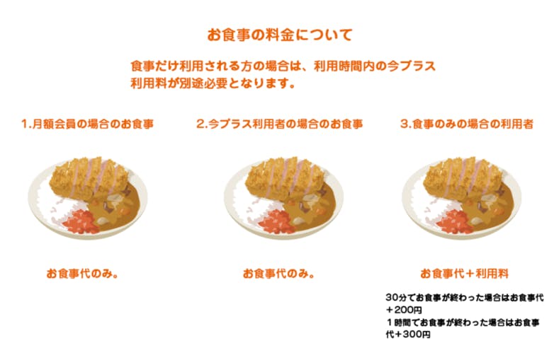 料理の提供金額に関してもお任せで、月額会員や今プラス利用者の方は料理のお金だけで食べていただくことができます。