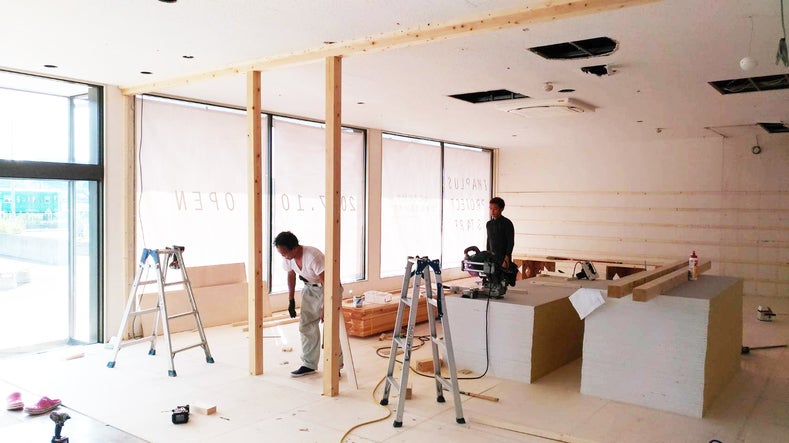 仕切りをパーテーションで区切るとどうしてもオフィスらしくなってしまうので、そうではなく木をつかって明るくなおかつ温かみがある感じでと伝えてまして、間の素材は木となる今回の今プラス。