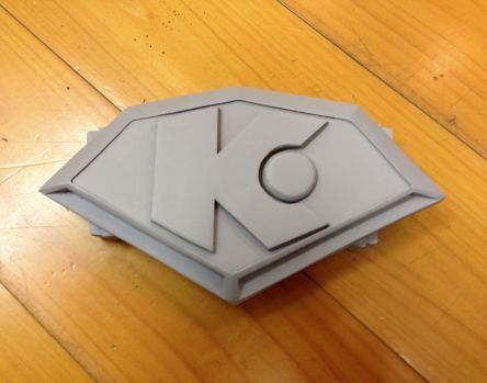 現在お見せできるパーツの一部として、ベルトバックルを公開いたします。もちろん、塗装などの処理はこれからとなりますが、形状は概ね写真のもので決定です。現行のキタキュウマンのベルトに比べ、とてもシャープなデザインになりました。また、「K」の部分が赤く発光する予定です。