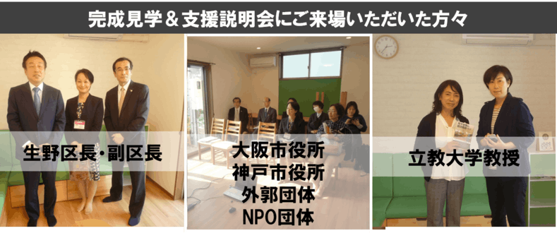 そして、このシングルマザー支援サポートの取り組みは行政からも注目され、完成見学&支援説明会には、生野区長・副区長をはじめ、大阪市役所・神戸市役所や、子育て関連の外郭団体やNPO法人の方々など、多くの方々にご参加いただきました。