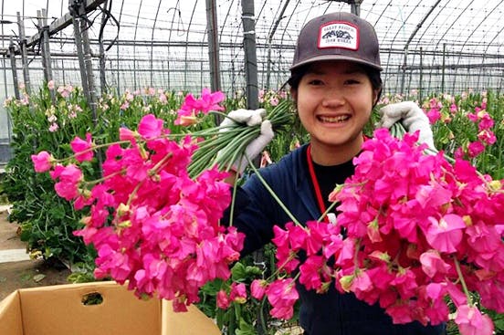 ▲日本一の生産量を誇る北郷町のスイートピーの収穫の様子。