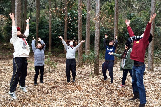 ▲ウッドチップ広場ではしゃぐ大学生