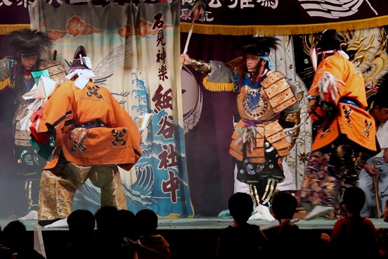 ▲八調子と呼ばれる激しい石見神楽が、一晩中繰り広げられる