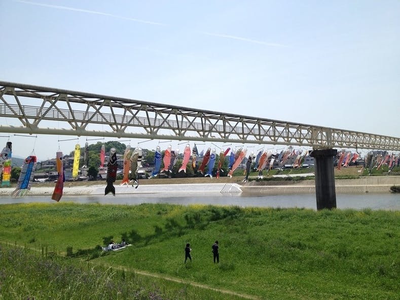 大きな木に登れば、陽の光を浴びて輝く大和川、柏原の街と、その向こうにあべのハルカス。天気がよければ遠く大阪湾の向こうまで見えるかもしれません。