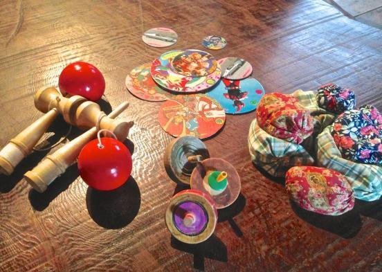 お手玉、あやとり、折り紙、けん玉、めんこ、こま、積み木等