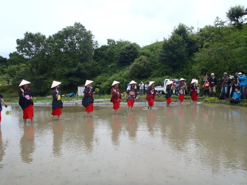 ▲早乙女による田植えの様子。毎年イベントを行っています!