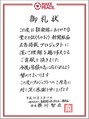 これを実現するために自衛隊員へ応援メッセージを伝えられる新聞広告を掲載したいと考えました。